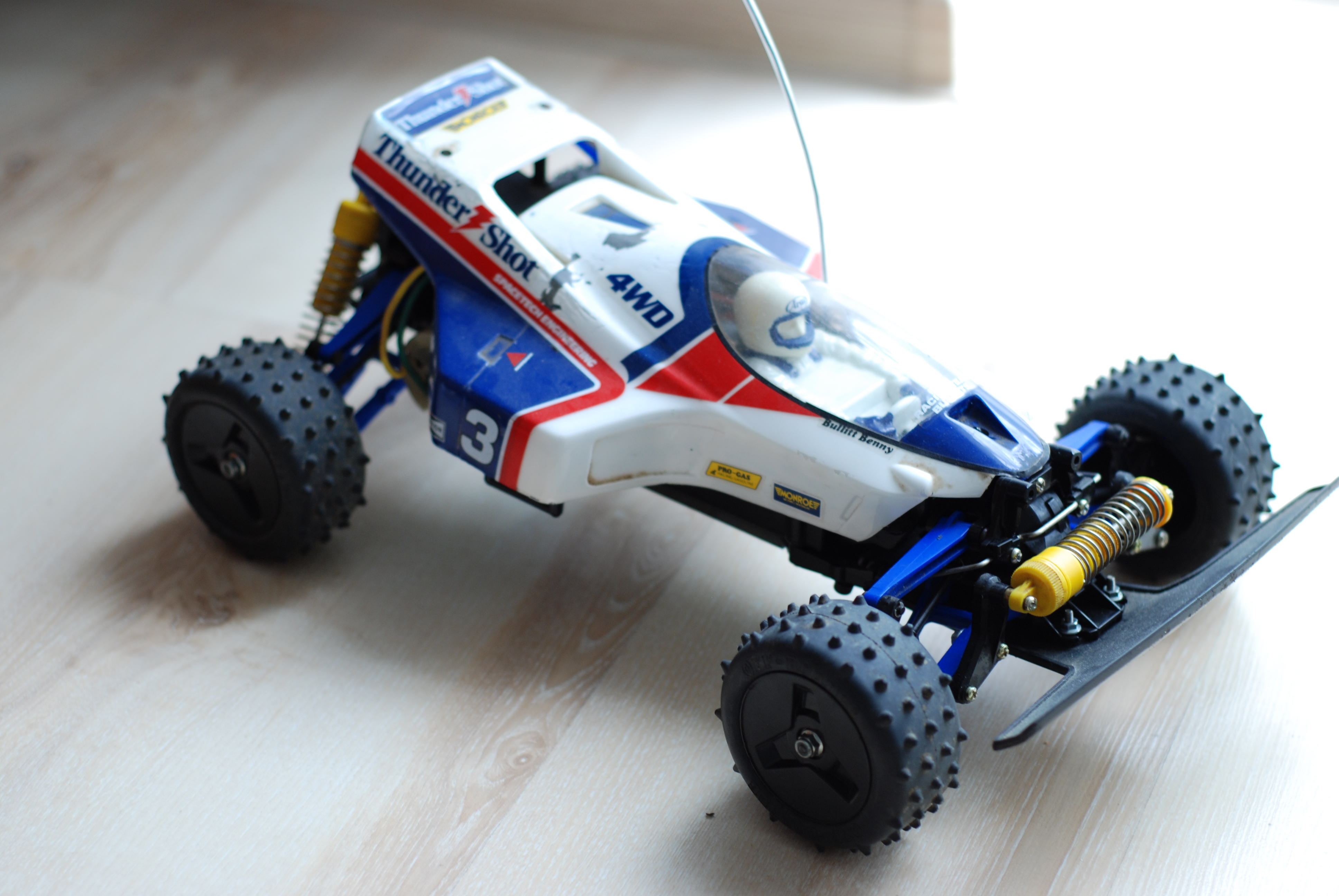| 【 Entry-Level Futuristic Buggy 】 Originally released in 1987, the Thunder Shot gained widespread popularity with its futuristic body styling, and Tamiya is now proud to announce the re-release of this classic off-road buggy. Its spaceship-like body is made from tough lightweight polycarbonate and even features a cockpit housing a driver figure for increased realism. The slick-looking black wheels are equipped with spike tires that provide excellent grip and the large rear wing helps add downforce for stable 4WD off-roading. |